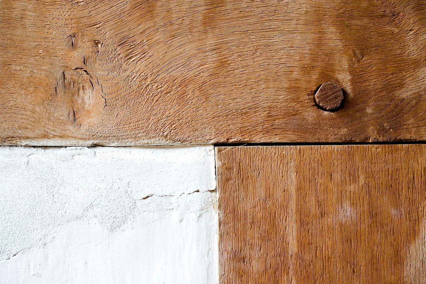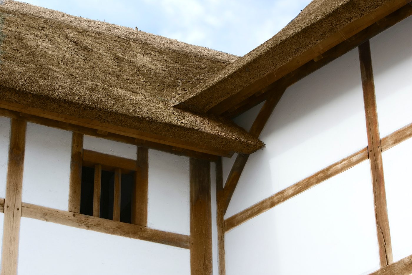 Built from oak beams, lime-plaster walls and a water-reed thatched roof.