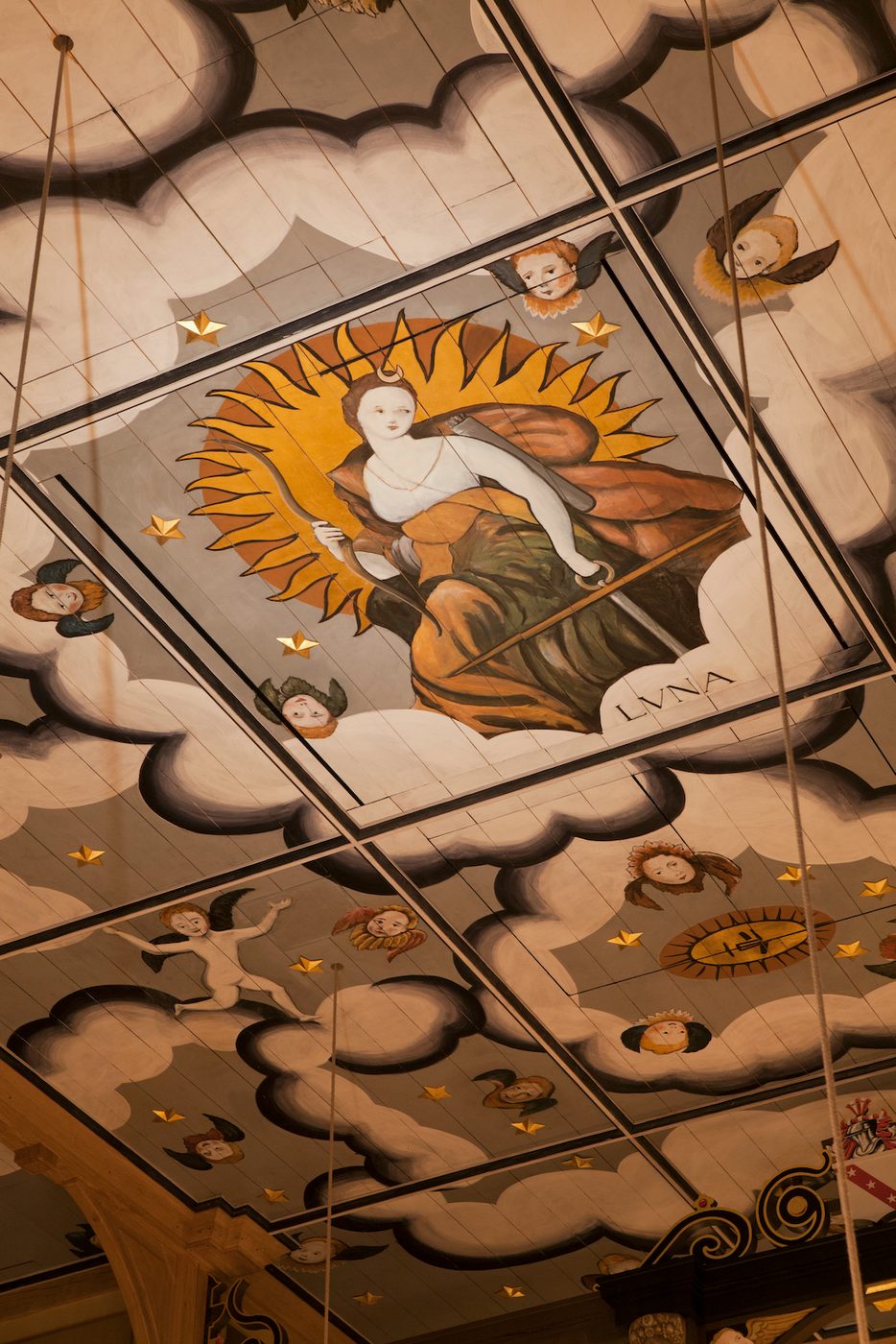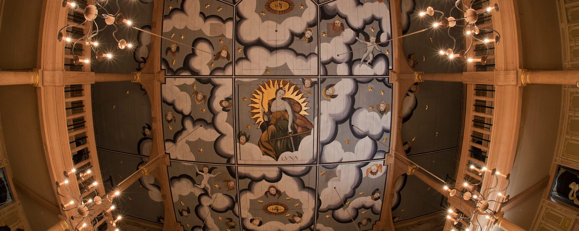Prior to decorating our present-day Playhouse ceiling, our researchers gathered information about carving and decoration methods used in original indoor playhouses. The final mural was based on photographs of a seventeenth-century ceiling in Scotland’s former Cullen House (also known as the ‘Astral Ceiling’) – the original design showing the goddess of the moon between clouds, stars, cherubs and putti. The Cullen House ceiling was damaged beyond repair by a fire in 1987.