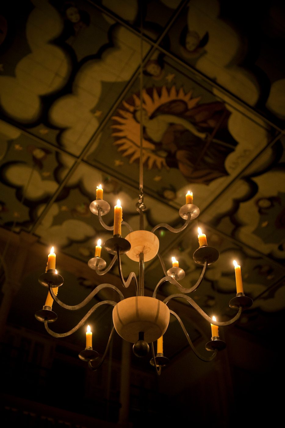 A decorated ceiling with candles