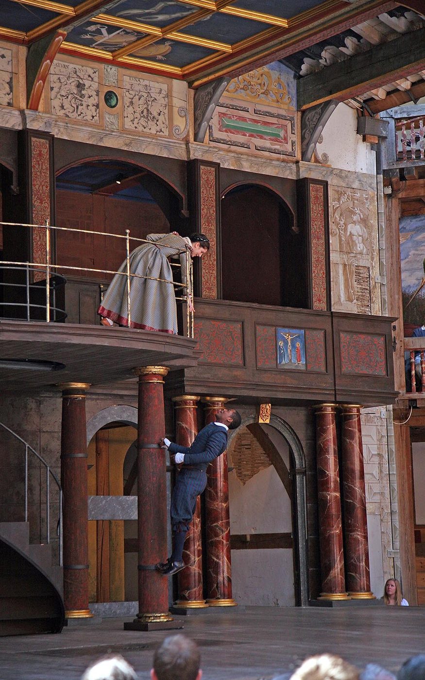 The word ‘balcony’ was not in use in English until 1618 and the famous ‘balcony scene’ is incorrectly named given that the only stage direction we have is for Juliet to appear at her window, but  because Romeo refers to it as ‘yonder’ window and refers to Juliet as the ‘sun’, it suggests he is looking up; thus we know it takes place on the upper stage.