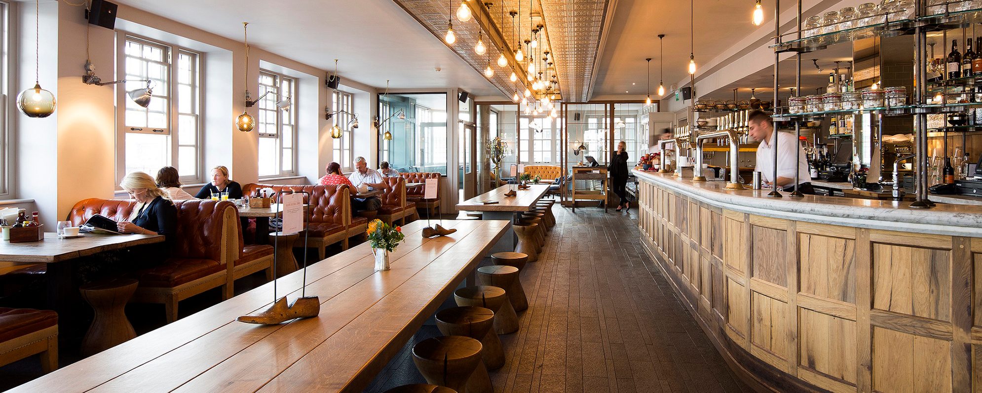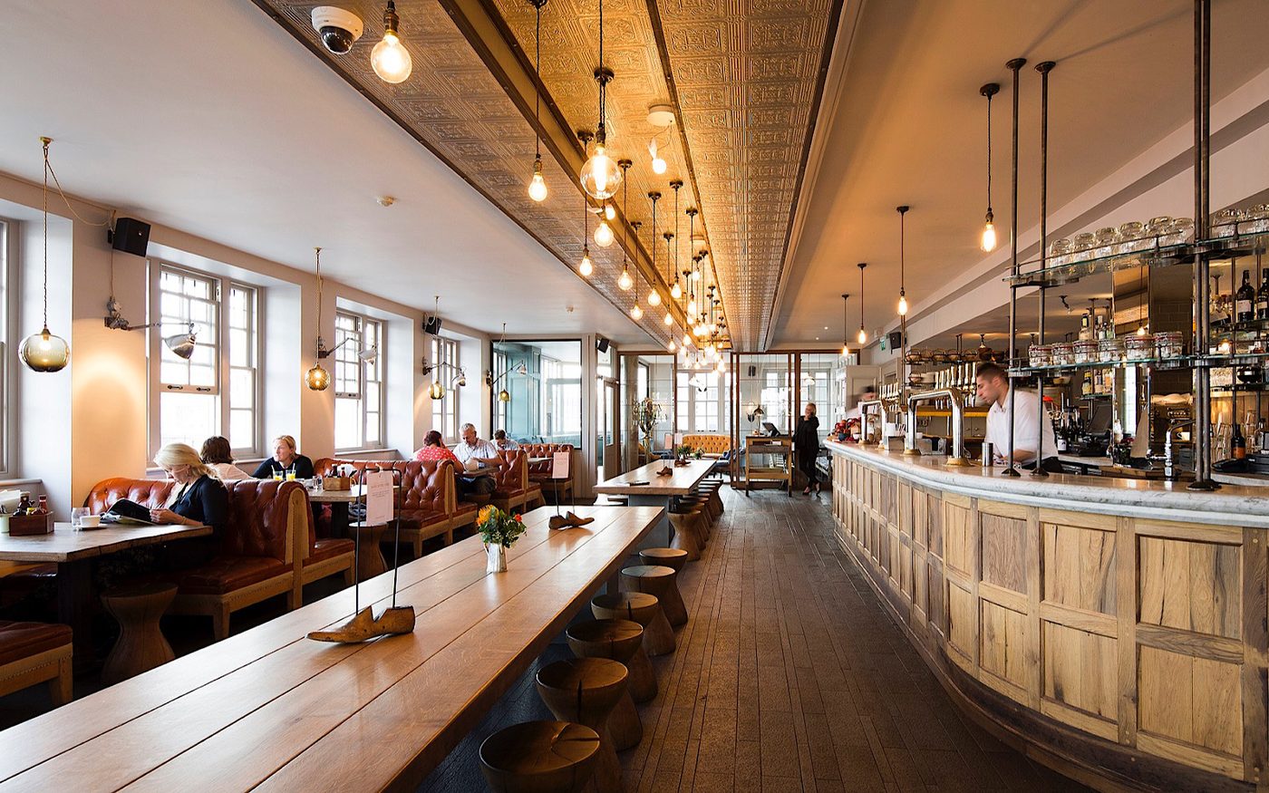 A bright and open bar space has bench and booth seating, lit by large bulbs from the ceiling